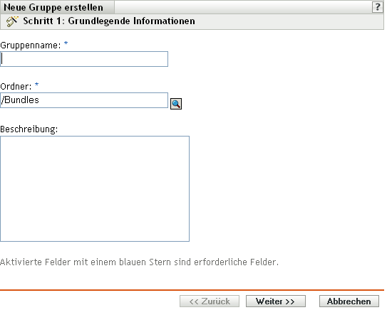 Gruppenname: (Erforderlich) Legen Sie einen eindeutigen Namen für Ihre Bundle-Gruppe fest. Dieser Name wird im ZENworks-Kontrollzentrum (dem Verwaltungswerkzeug für ZENworks Linux Management) und auf der Bedienoberfläche angezeigt.
