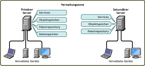 Die Architektur des ZENworks-Systems besteht aus zwei Hauptkomponenten, ZENworks-Servern und verwalteten Geräten. Diese in Verwaltungsdomänen angeordneten Komponenten werden als ZENworks-Verwaltungszonen bezeichnet.