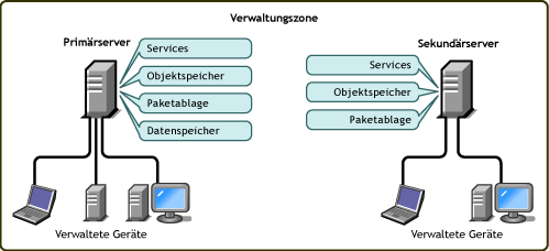 Die Architektur des ZENworks-Systems besteht aus zwei Hauptkomponenten, ZENworks-Servern und verwalteten Geräten. Diese in Verwaltungsdomänen angeordneten Komponenten werden als ZENworks-Verwaltungszonen bezeichnet.