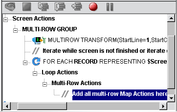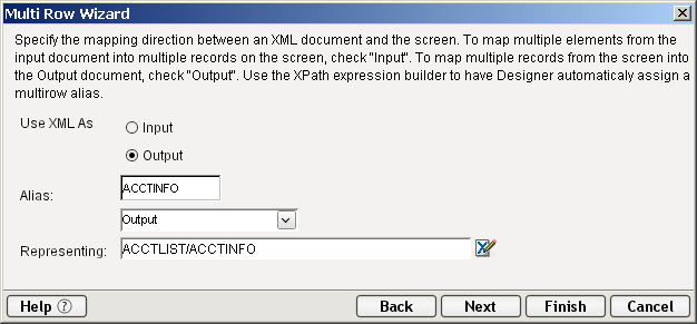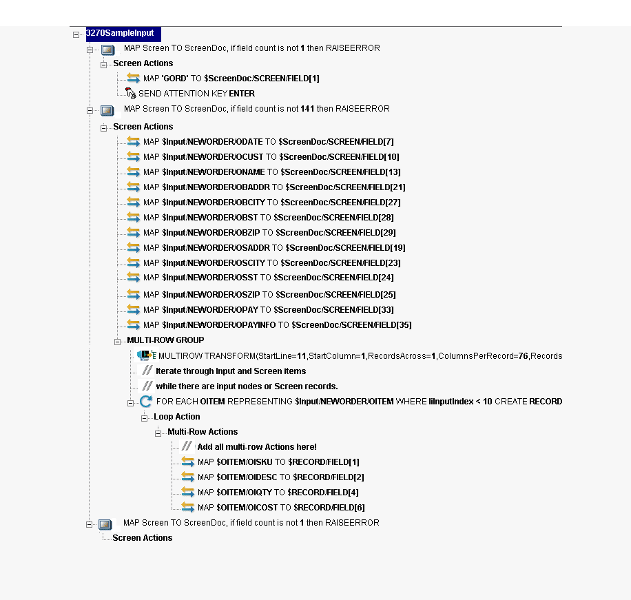 The Multi Row action can be used to input data from an XML document to a 3270 screen, or to output data from a 3270 screen to an XML document. This action essentially creates repeat loops within the Action Model that map multiple rows of data automatically from one document or screen to another. The Multi Row action is discussed in detail in "About the 3270 Multi Row Wizard" on page 48.