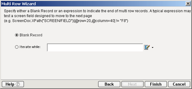 Select the Blank Record radio button. This tells the wizard that a blank record indicates the end point of the loop action. You may also use the Expression builder to set a different indicator for the loop's end point. For more information on using the Expression builder, please see the exteNd Composer User's Guide