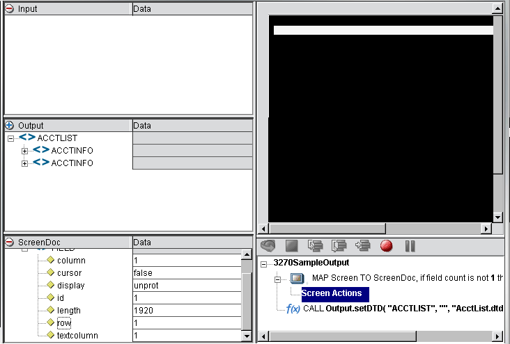 From the View menu, select Expand XML Documents. This expands all of the parents, children, data elements, etc. of the XML Documents, which allows you to see the results of the executed component. If you do not expand the XML Documents, you won't see if the data you wanted to move from the 3270 environment made it to the Output DOM.
