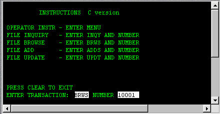 In this example, "BRWS" is entered in the TRANSACTION field and "10001" in the NUMBER field.
