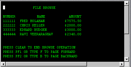 NOTE: The 3270 screen itself contains the instructions for the iteration keys. For this example, the FILE BROWSE screen included instructions that said to use the F1 key to page forward.