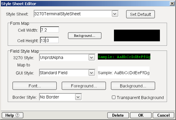 From the Component menu on the 3270 Component Editor window, select Style Sheet. The Style Sheet Editor dialog appears.