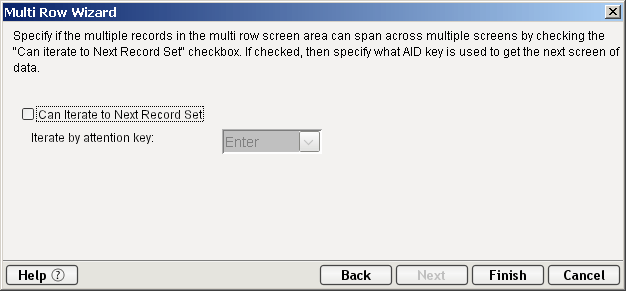 Click the Next button. The Iterate screen of the Multi Row Wizard appears. This screen tells the wizard what to do when it encounters an end of page.