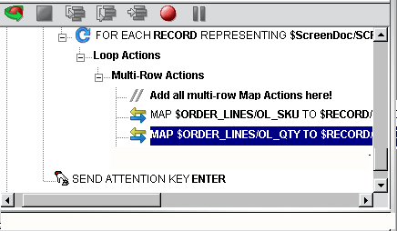 Notice that Map actions within the Multi Row actions block reference fields by their relative position in the row and not their absolute position within the screen. So the target of the first Map action is $RECORD/FIELD[1]. Using drag and drop to create your Map actions within the context of the Multi Row will create and assign these field indexes for you automatically.
