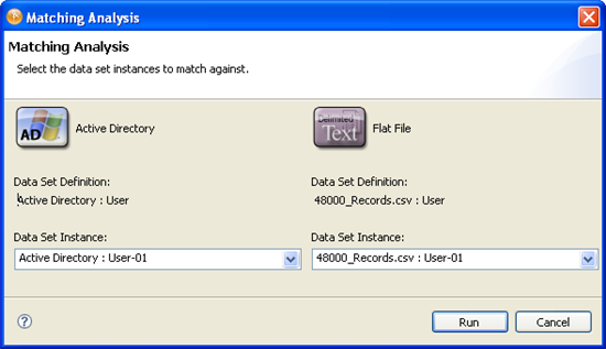 In the Matching Analysis dialog box, select a specific data set instance for each data set against which you want to run the matching value search, then click .