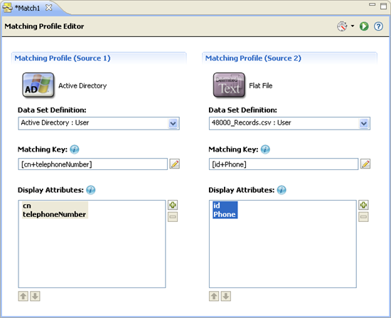 In the Matching Profile editor, select the matching characteristics for both Source 1 and Source 2.