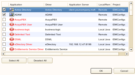 By default, Analyzer selects all applications for which Analyzer drivers exist. Applications for which Analyzer doesn’t have drivers display in red.
