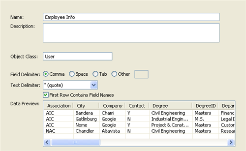 Object Class: Specify the object class to which the attribute values in the selected file should be associated. For example, a file of user information should be associated with the User class.