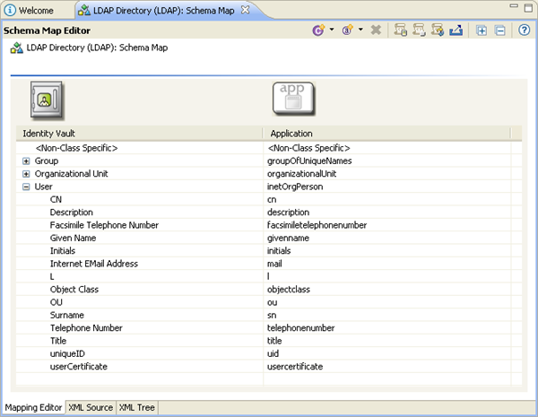 The Schema Map Editor includes several icons in a toolbar. For more information about these icons, see Section 1.4.3, Schema Map Editor. The Schema Map Editor provides access to the Schema Manager from Designer for Identity Manager. For detailed information about Designer’s Schema Manager, see Managing the Schema