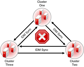 If you have three or more clusters each in separate eDirectory trees in your business continuity cluster, you should set up IDM User object and Cluster Resource object synchronization in a manner that prevents Identity Manager synchronization loops. Identity Manager synchronization loops can cause excessive network traffic and slow server communication and performance.
