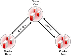 A preferred method is to make Cluster One an Identity Manager synchronization master in which Cluster One synchronizes with Cluster Two, and Cluster Two and Cluster Three both synchronize with Cluster One. This is illustrated in Figure B-2.