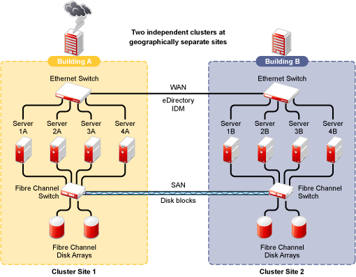 Figure 1-3 shows a two-site business continuity cluster that uses storage-based data replication between the sites. BCC uses eDirectory and Identity Manager to synchronize cluster information between the two clusters.