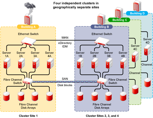 Figure 1-4 depicts a four-site business continuity cluster that uses storage-based data replication between the sites. BCC uses eDirectory and Identity Manager to synchronize cluster information between the two clusters.