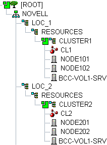 When a resource is BCC-enabled, its configuration is automatically synchronized with every peer cluster in the business continuity cluster by using customized Identity Manager drivers. The following eDirectory objects are created in each peer cluster: