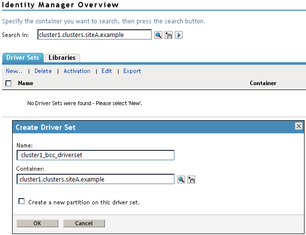 It is not necessary to create an eDirectory partition for the driver set because the parent cluster container where you are creating the driver set is partitioned.