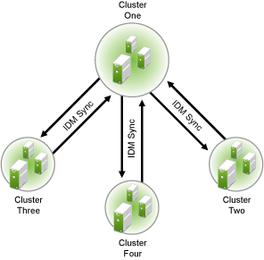 A preferred method is to make Cluster One an Identity Manager synchronization master. Cluster One synchronizes with Cluster Two. Cluster Two and Cluster Three both synchronize with Cluster One. This is illustrated in Figure 6-2 below.