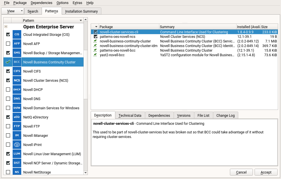 On the Software Management page, select the Novell Business Continuity Cluster pattern.