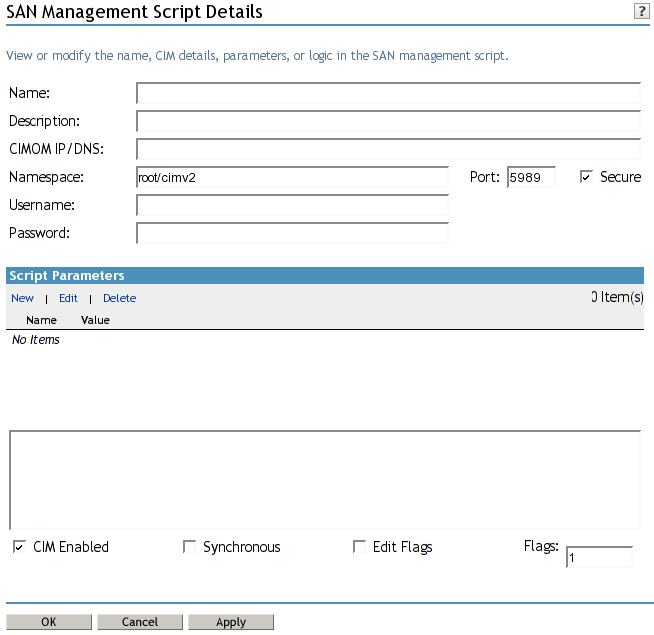 Used for CIM (Common Information Model) and SMI-S (Storage Management Initiative Specification) enabled scripts that manage a physical SAN. These are not used for the dynamic DNS script. Deselect the check box. After this check box is deselected, the CIMON IP/DNS, Namespace, Port, Secure, User name, and Password controls are all disabled. |