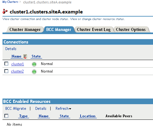 NOTE:If the cluster view report shows only one peer cluster instead of showing all the peer clusters, execute the command cluster refresh -p on that node. For more information, Section 10.2.1, Incorrect Status in the Cluster View Report After Enabling BCC on Peer Clusters.