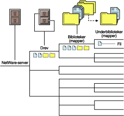 I Novell® Easy Administration ToolTM (NEAT) begynder filsystemets struktur med et drevobjekt i biblioteksvisningen. Under drevet kan du oprette biblioteker, underbiblioteker og filer som data- og programfiler.