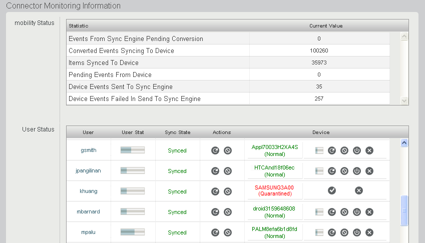 Quarantined devices display in red. The user’s sync state displays as because data has synchronized from the user’s GroupWise mailbox to the Mobility Connector, but the data has not yet synchronized to the user’s mobile device.