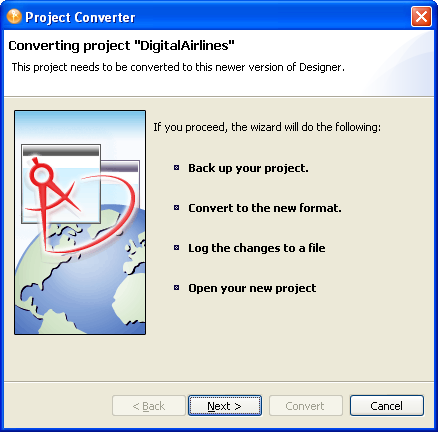 When you proceed, Designer closes all the editors, even if they belong to other projects, because the projects probably need to be converted. This procedure ensures that you must manually re-open each project. The Project Converter can then back up and convert the project if Designer detects that these tasks are necessary.