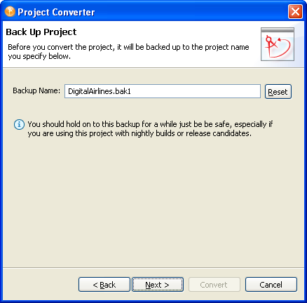 The Project Converter backs up your project before converting. You can accept or change the default name.