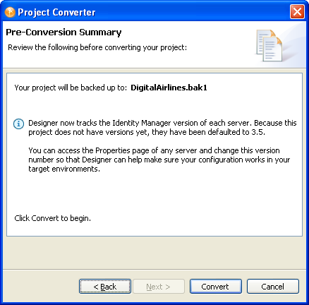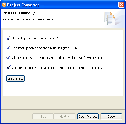 The converter ensures only forward compatibility. It does not ensure backward compatibility. You can’t convert to a newer release of Designer and then convert back if you want to return to an older release. If you need to go back to an earlier format, use the project’s backup file.