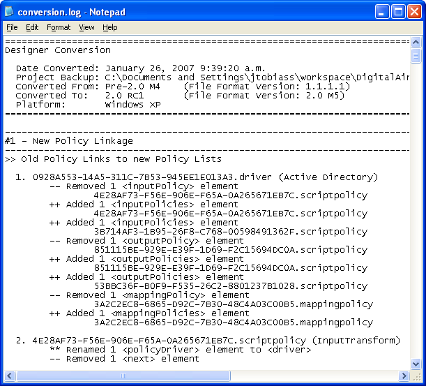 The conversion.log file is in the project folder in the Workspace directory (for example, c:\documents and settings\skopai\digitalairlines\conversion.log).
