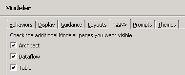 Determines whether the Architect, Dataflow, and Table pages display as tabs at the bottom of the Modeler. By default, the Developer page (mode) appears in the Modeler. Displaying the additional tabs enables you to quickly toggle among pages.