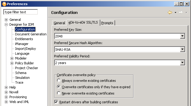 When you create certificates, Designer reads the preferences, including Preferred Key Size, Preferred Secure Hash Algorithm, and Preferred Validity Period. These options are also available through > .