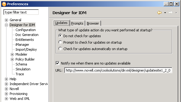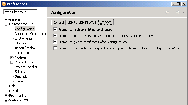 Controls whether or how often you receive a prompt whenever you add the DirXML-EntitlementRef attribute to a driver filter. The default is , but because this attribute is added only if it doesn’t already exist on the driver filter, you can select to not see the pop-up window.