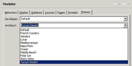 Defines themes for the Developer and Architect modes. Customizes the colors of the background, text, line, Domain Group background, and Domain Group title in the Modeler.