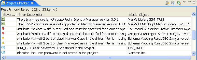 The Project Checker looks at specific items in the project. It checks the items in the User Application as well as the rest of Identity Manager.