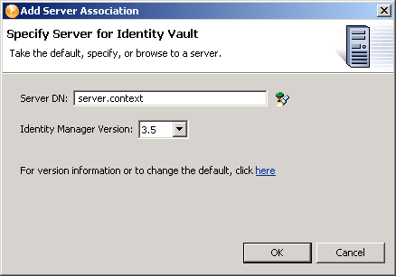 Additionally, a live update button retrieves current Identity Manager and eDirectory version information on the server properties page. The new dialog box allows you to specify version information when an Identity Vault is created.