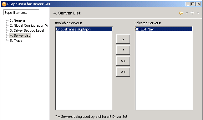 IMPORTANT:If a server in the Available Server list has an asterisk, that server is already associated with another driver set. If you choose to use that server, Designer removes the existing association for the server from the driver set. Each server can be associated with only one driver set at a time.