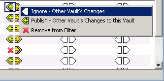If a particular flow (Publisher or Subscriber channel) is not defined in the policy filter’s XML, a red X replaces the Publisher or Subscriber channel arrow. This means that it’s not in the policy and there will be no flow. This scenario is essentially the same as an Ignore Flow icon, which is an empty white arrow. However, the distinction is useful so that you know what is actually in your policy’s XML.