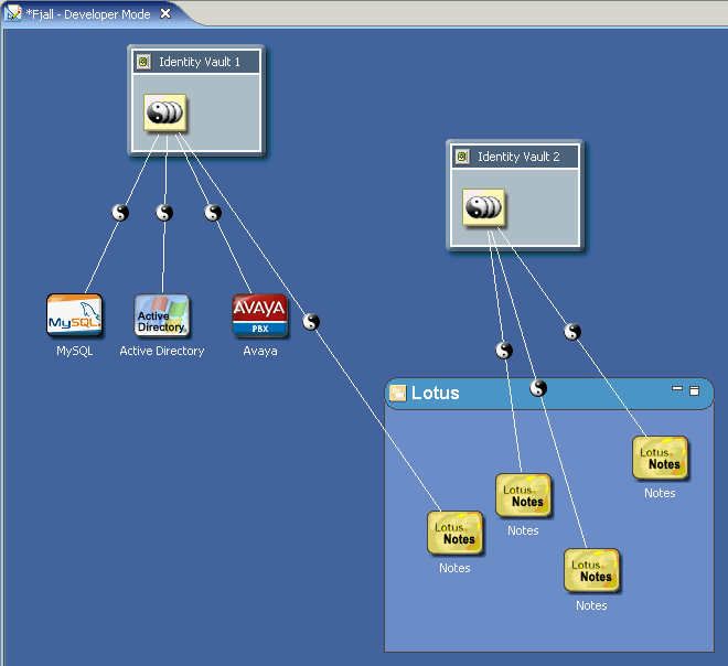 When you use the palette’s Connection function to connect an application to an Identity Vault, you can begin or end your driver line at the Identity Vault. The line automatically connects to a driver set in an Identity Vault.