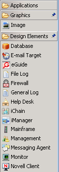 In Architect mode, the palette alphabetically lists all applications in one folder and design elements in another folder.