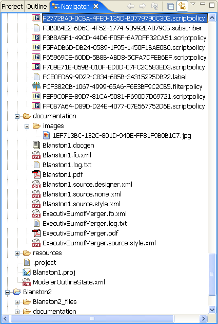 The Navigator view enables you to manage and view the file resources that are in your workspace. You can see your projects and files as they actually exist in the file system. You can add files and folders, and append them to your projects or workspace. These extra items won’t change or affect the behavior of your Identity solution. However, they enable you to conveniently append other pieces of information that you want to associate with your projects and workspace.
