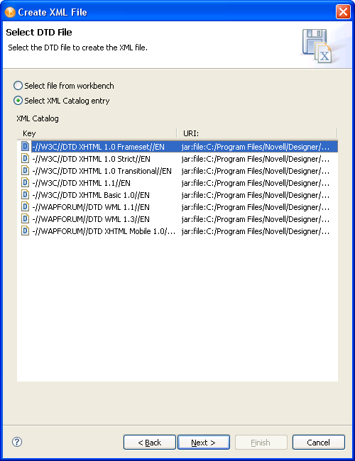 Choose one of the XML Catalog entries from the list. You can edit this list in the Preferences > Web and XML > XML Catalogs.