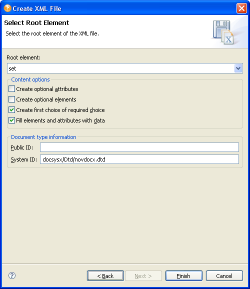 You use the New XML File Wizard to create new XML Files. The wizard can create an empty XML file or a generated XML file based on an XML schema or DTD. Generated files contain skeleton XML data that is generated based on a given root element and an XML Schema or DTD.