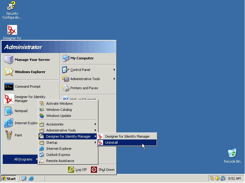 On Windows, an Uninstall item was added to the Designer for Identity Manager program group. Select the Uninstall item to uninstall Designer.