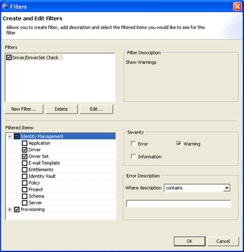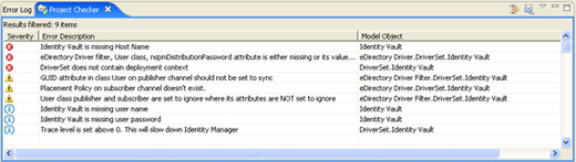 This feature will show user missing data, inconsistencies in the model, dependency related problems between model objects and any problem that would make the deployment of Identity Manager fail. The Project Checker view is accessible from Window -> Show View -> Project Checker.
