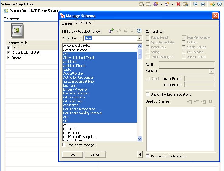 Selecting "Add Identity Vault Attributes..." brings up the schema browser allowing you to select multiple attributes to add.