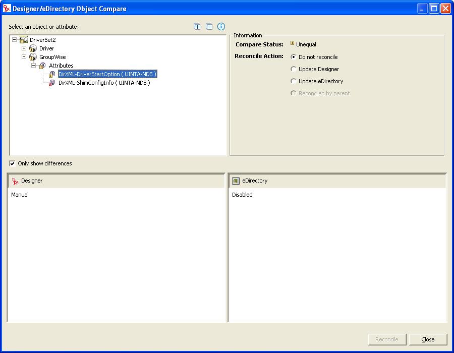 | Equal | The selected attribute value or all attributes of the selected object are the same in eDirectory and Designer |