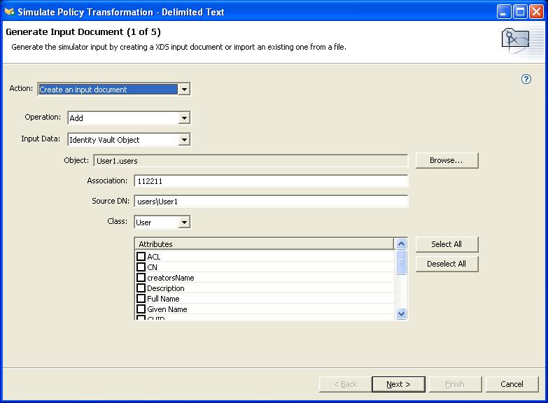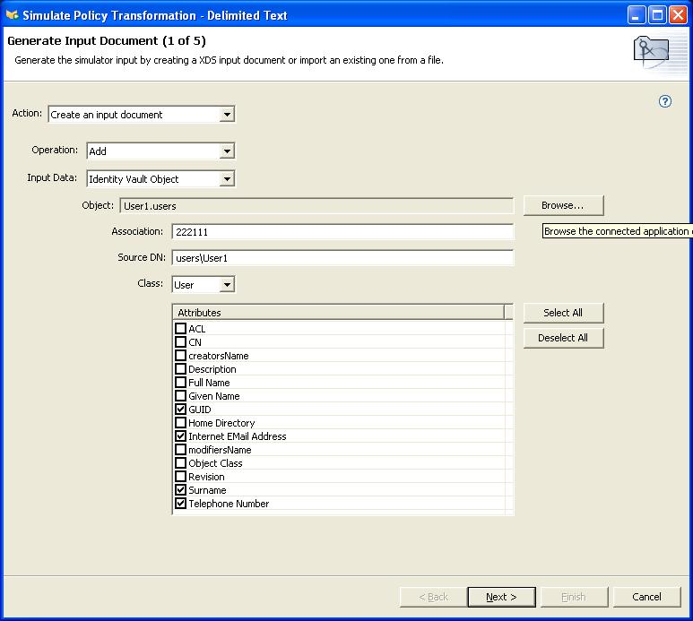 The remaining two Input Data options can only be used when the Identity Vault or connected application are available. The "Identity Vault Object" option allows the user browse and select an any object in the Identity Vault. The simulator will read the object and fill in the appropriate controls based on the operation type. For add and modify operations the simulator will display all of the objects attributes in the attribute table. The user can then select the attributes they wish to include in the input document and the actual eDirectory values will be included in the input document.